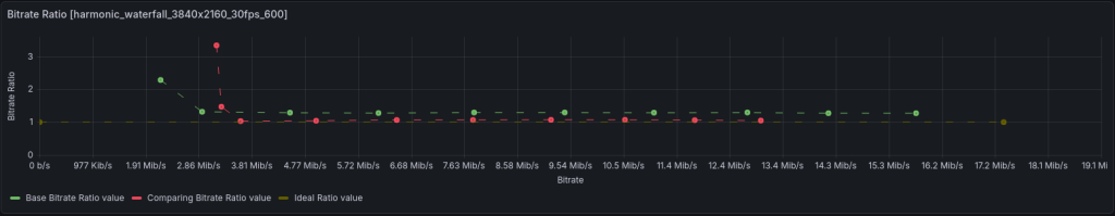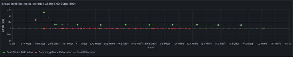On the waterfall, the overshoot is even greater — about 30% across the entire range and 2.3x at the lowest bitrate. For the software encoder, the ratio of required bitrate to actual is close to 1 (undershoot within 1%) starting from 2.3 Mbit/s: