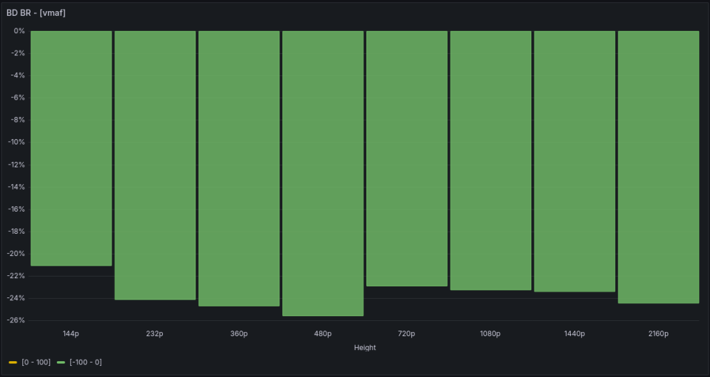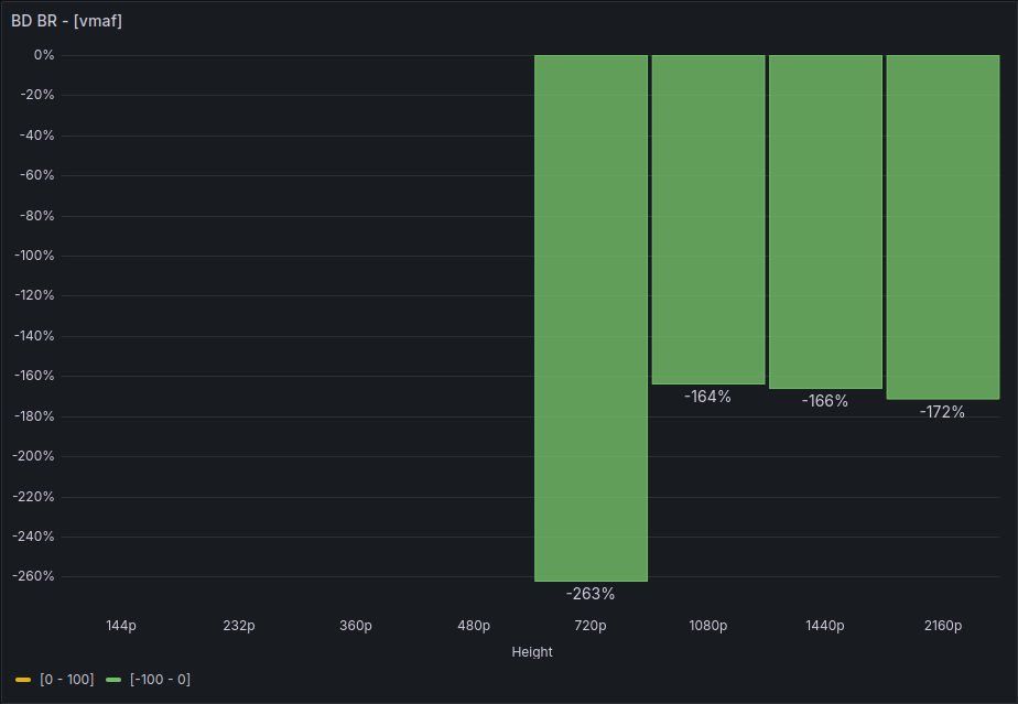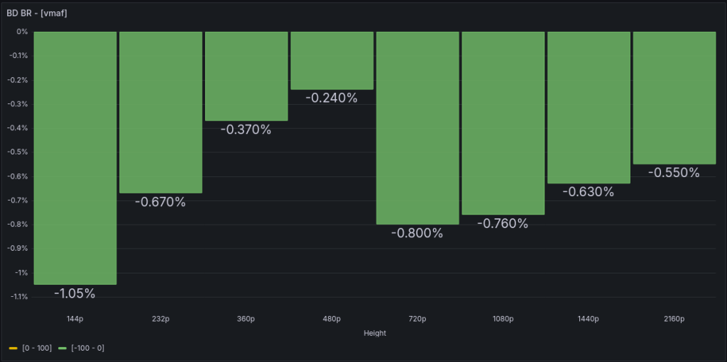 Сравнение сам с собой. Здесь и далее усреднённые значения BDBR VMAF по всем видео (напомню, что отрицательный BDBR это хорошо, положительный — плохо).