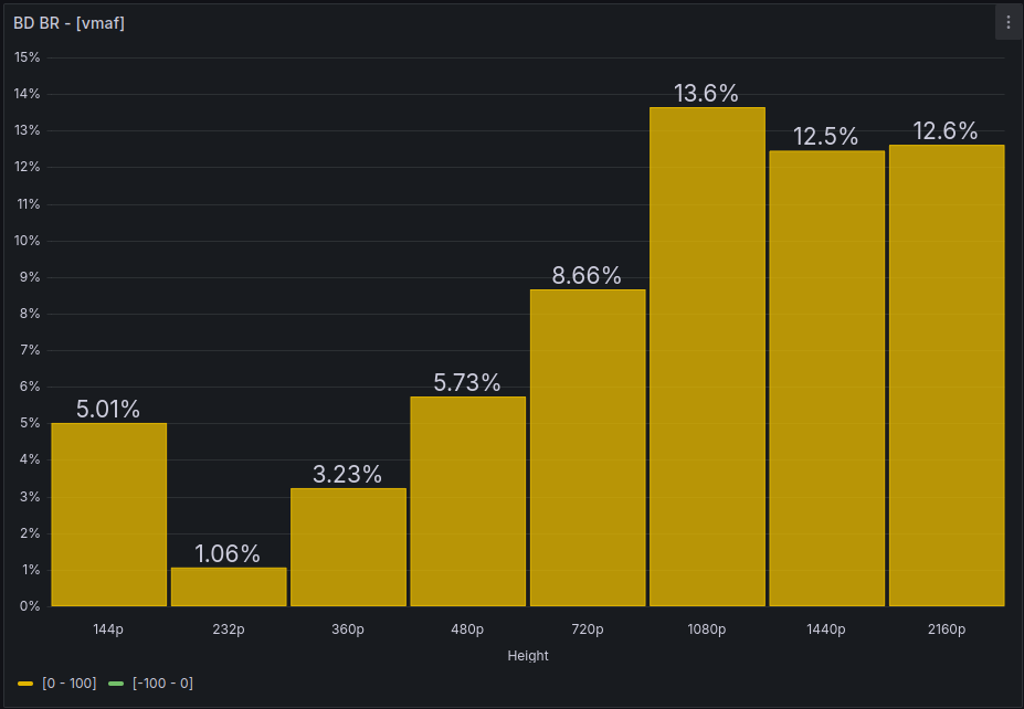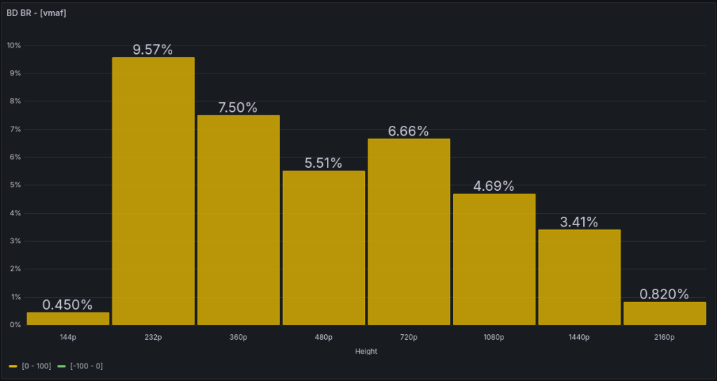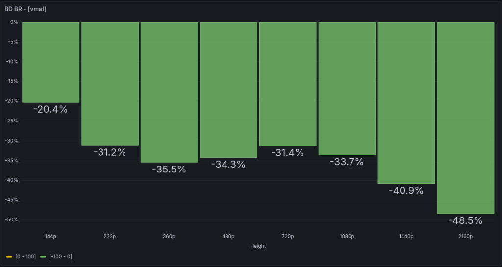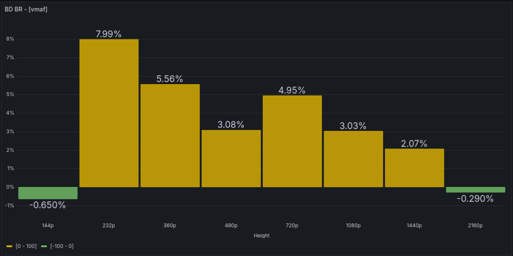 В принципе, ничего неожиданного. Проигрыш по битрейту в пределах 7% — 11% по основным размерам кадров. Что, в общем, неплохо.
