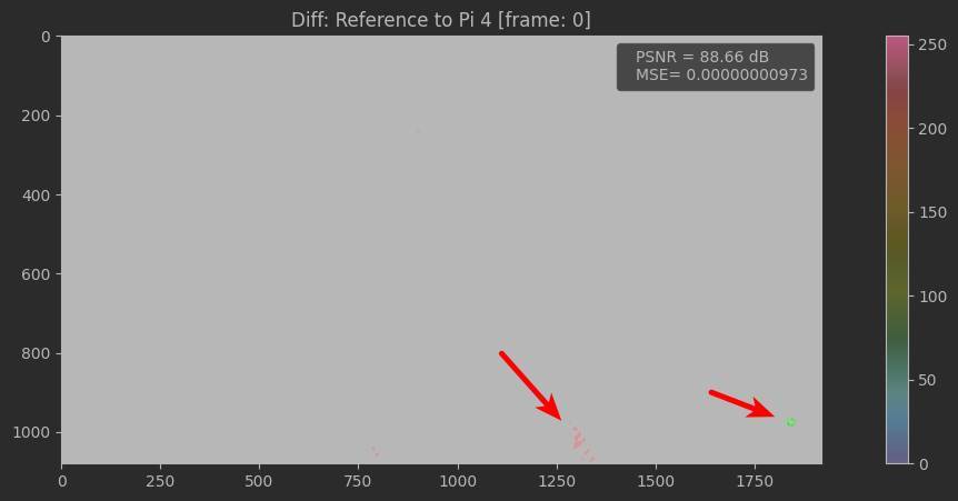 Покадровый анализ показал области с большой разницей между тем, что выдаёт декодер Pi 4 и эталоном: