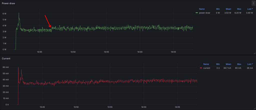 По энергопотреблению в среднем зафиксировал 3.6Вт в режиме транскодирования (задействованы оба блока и декодирования и кодирования). В простое плата потребляет 3.3Вт. Стрелкой отмечен момент начала теста.